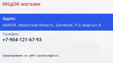 МёдОК, магазин по адресу 666034, Иркутская область, Шелехов, 9-й квартал, 8 в дальнейшем Организация, размещена в следующих категориях: