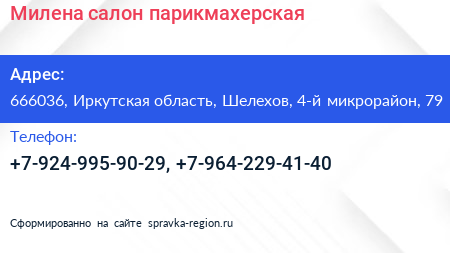 Милена, салон-парикмахерская по адресу 666036, Иркутская область, Шелехов, 4-й микрорайон, 79 в дальнейшем Организация, размещена в следующих категориях: