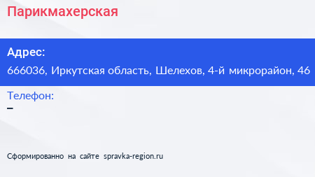 Парикмахерская по адресу 666036, Иркутская область, Шелехов, 4-й микрорайон, 46 в дальнейшем Организация, размещена в следующих категориях: