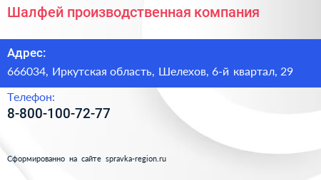Шалфей, производственная компания по адресу 666034, Иркутская область, Шелехов, 6-й квартал, 29 в дальнейшем Организация, размещена в следующих категориях: