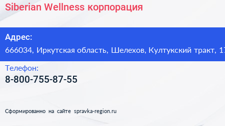 Siberian Wellness, корпорация по адресу 666034, Иркутская область, Шелехов, Култукский тракт, 17 в дальнейшем Организация, размещена в следующих категориях: