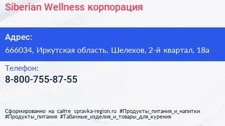 Siberian Wellness, корпорация по адресу 666034, Иркутская область, Шелехов, 2-й квартал, 18а в дальнейшем Организация, размещена в следующих категориях: