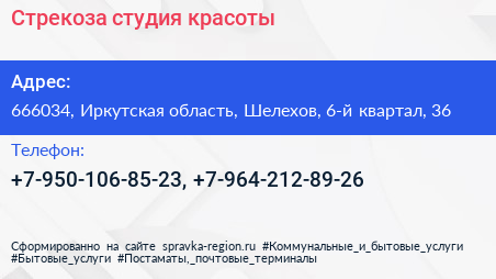 Стрекоза, студия красоты по адресу 666034, Иркутская область, Шелехов, 6-й квартал, 36 в дальнейшем Организация, размещена в следующих категориях: