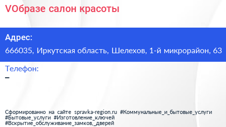 VОбразе, салон красоты по адресу 666035, Иркутская область, Шелехов, 1-й микрорайон, 63 в дальнейшем Организация, размещена в следующих категориях:
