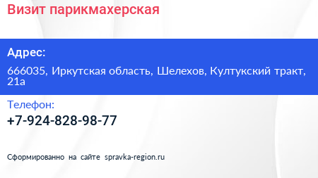 Визит, парикмахерская по адресу 666035, Иркутская область, Шелехов, Култукский тракт, 21а в дальнейшем Организация, размещена в следующих категориях: