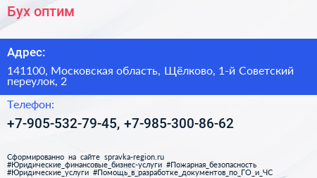 Бух оптим по адресу 141100, Московская область, Щёлково, 1-й Советский переулок, 2 в дальнейшем Организация, размещена в следующих категориях: