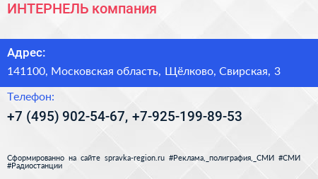 ИНТЕРНЕЛЬ, компания по адресу 141100, Московская область, Щёлково, Свирская, 3 в дальнейшем Организация, размещена в следующих категориях: