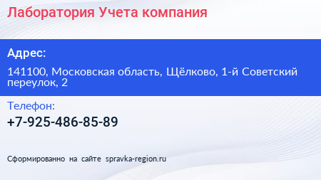 Лаборатория Учета, компания по адресу 141100, Московская область, Щёлково, 1-й Советский переулок, 2 в дальнейшем Организация, размещена в следующих категориях: