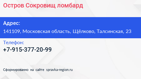 Остров Сокровищ, ломбард по адресу 141109, Московская область, Щёлково, Талсинская, 23 в дальнейшем Организация, размещена в следующих категориях: