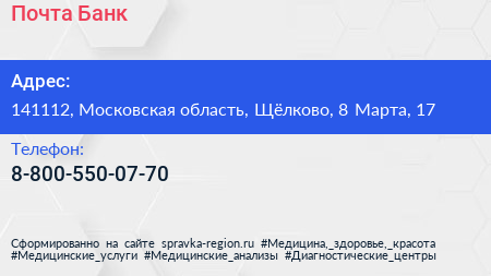 Почта Банк по адресу 141112, Московская область, Щёлково, 8 Марта, 17 в дальнейшем Организация, размещена в следующих категориях: