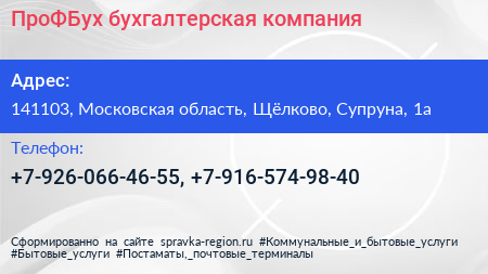 ПроФБух, бухгалтерская компания по адресу 141103, Московская область, Щёлково, Супруна, 1а в дальнейшем Организация, размещена в следующих категориях: