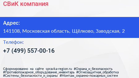 СВиК, компания по адресу 141108, Московская область, Щёлково, Заводская, 2 в дальнейшем Организация, размещена в следующих категориях: