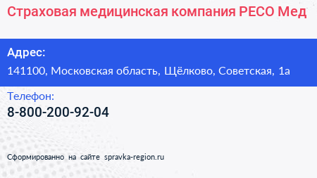 Страховая медицинская компания РЕСО-Мед по адресу 141100, Московская область, Щёлково, Советская, 1а в дальнейшем Организация, размещена в следующих категориях: