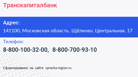 Транскапиталбанк по адресу 141100, Московская область, Щёлково, Центральная, 17 в дальнейшем Организация, размещена в следующих категориях: