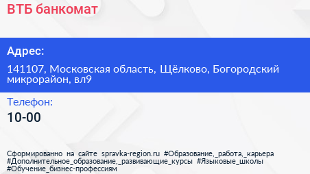 ВТБ, банкомат по адресу 141107, Московская область, Щёлково, Богородский микрорайон, вл9 в дальнейшем Организация, размещена в следующих категориях: