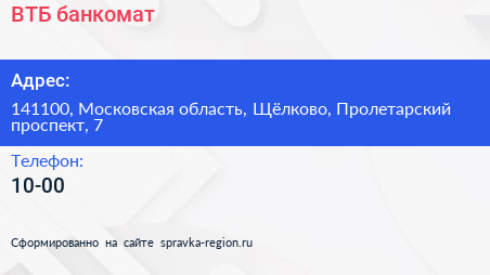 ВТБ, банкомат по адресу 141100, Московская область, Щёлково, Пролетарский проспект, 7 в дальнейшем Организация, размещена в следующих категориях:
