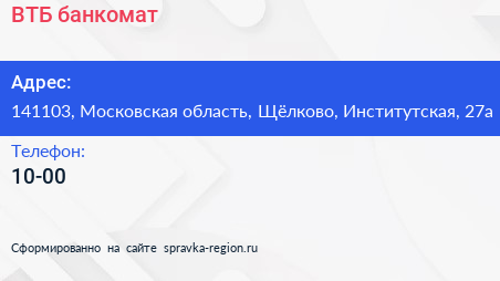 ВТБ, банкомат по адресу 141103, Московская область, Щёлково, Институтская, 27а в дальнейшем Организация, размещена в следующих категориях: