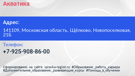 Акватика по адресу 141109, Московская область, Щёлково, Новопоселковая, 21Б в дальнейшем Организация, размещена в следующих категориях: