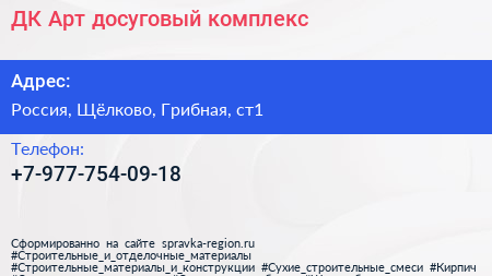 ДК Арт, досуговый комплекс по адресу 1, Грибная улица, КП «Заповедный парк-2», Валентиновка, Оболдино, городской округ Щёлково, Московская область, Центральный федеральный округ, 141134, Россия в дальнейшем Организация, размещена в следующих категориях: