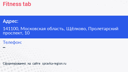 Fitness-tab по адресу 141100, Московская область, Щёлково, Пролетарский проспект, 10 в дальнейшем Организация, размещена в следующих категориях: