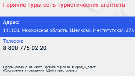 Горячие туры, сеть туристических агентств по адресу 141103, Московская область, Щёлково, Институтская, 27а в дальнейшем Организация, размещена в следующих категориях: