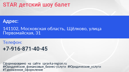STAR, детский шоу-балет по адресу 141102, Московская область, Щёлково, улица Первомайская, 31 в дальнейшем Организация, размещена в следующих категориях:
