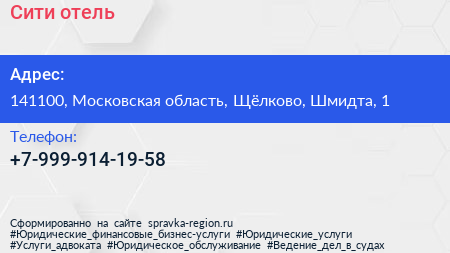 Сити, отель по адресу 141100, Московская область, Щёлково, Шмидта, 1 в дальнейшем Организация, размещена в следующих категориях: