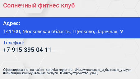 Солнечный, фитнес-клуб по адресу 141100, Московская область, Щёлково, Заречная, 9 в дальнейшем Организация, размещена в следующих категориях: