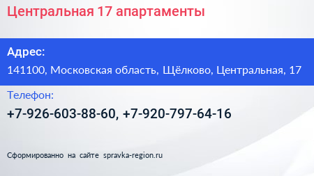 Центральная 17, апартаменты по адресу 141100, Московская область, Щёлково, Центральная, 17 в дальнейшем Организация, размещена в следующих категориях:
