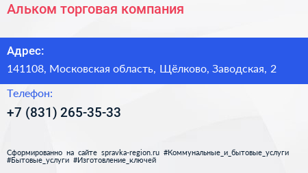 Альком, торговая компания по адресу 141108, Московская область, Щёлково, Заводская, 2 в дальнейшем Организация, размещена в следующих категориях: