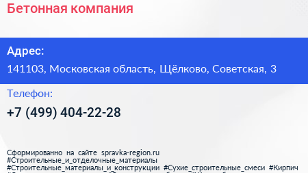 Бетонная компания по адресу 141103, Московская область, Щёлково, Советская, 3 в дальнейшем Организация, размещена в следующих категориях: