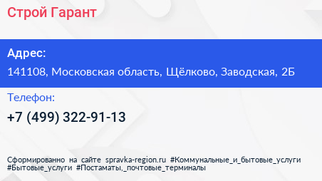 Строй Гарант по адресу 141108, Московская область, Щёлково, Заводская, 2Б в дальнейшем Организация, размещена в следующих категориях: