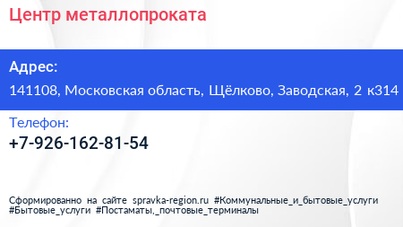 Центр металлопроката по адресу 141108, Московская область, Щёлково, Заводская, 2 к314 в дальнейшем Организация, размещена в следующих категориях:
