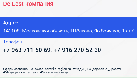 De Lest, компания по адресу 141108, Московская область, Щёлково, Фабричная, 1 ст7 в дальнейшем Организация, размещена в следующих категориях: