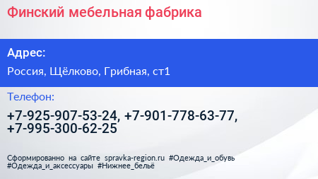 Финский, мебельная фабрика по адресу 1, Грибная улица, КП «Заповедный парк-2», Валентиновка, Оболдино, городской округ Щёлково, Московская область, Центральный федеральный округ, 141134, Россия в дальнейшем Организация, размещена в следующих категориях: