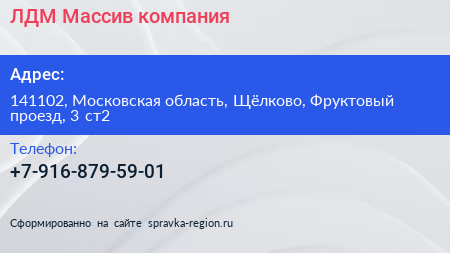 ЛДМ Массив, компания по адресу 141102, Московская область, Щёлково, Фруктовый проезд, 3 ст2 в дальнейшем Организация, размещена в следующих категориях:
