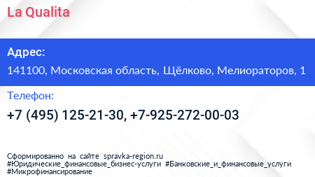 La Qualita по адресу 141100, Московская область, Щёлково, Мелиораторов, 1 в дальнейшем Организация, размещена в следующих категориях: