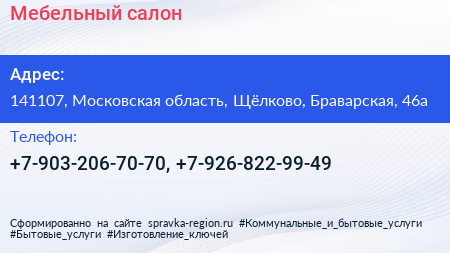 Мебельный салон по адресу 141107, Московская область, Щёлково, Браварская, 46а в дальнейшем Организация, размещена в следующих категориях: