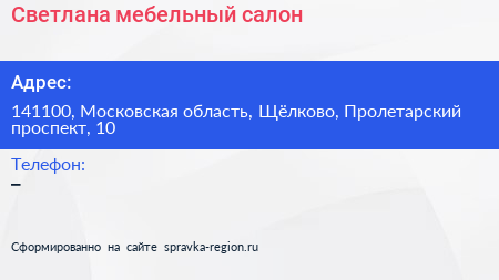 Светлана, мебельный салон по адресу 141100, Московская область, Щёлково, Пролетарский проспект, 10 в дальнейшем Организация, размещена в следующих категориях: