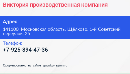 Виктория, производственная компания по адресу 141100, Московская область, Щёлково, 1-й Советский переулок, 25 в дальнейшем Организация, размещена в следующих категориях: