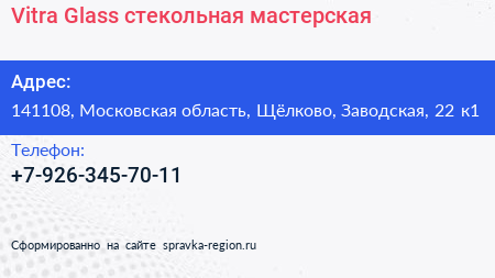 Vitra-Glass, стекольная мастерская по адресу 141108, Московская область, Щёлково, Заводская, 22 к1 в дальнейшем Организация, размещена в следующих категориях: