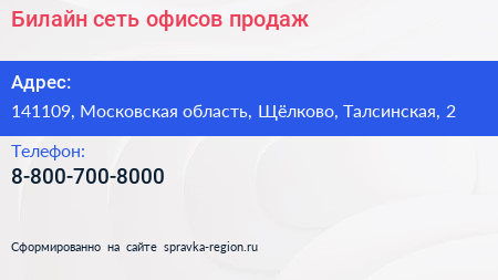 Билайн, сеть офисов продаж по адресу 141109, Московская область, Щёлково, Талсинская, 2 в дальнейшем Организация, размещена в следующих категориях: