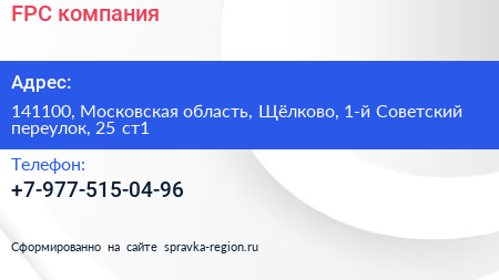 FPC, компания по адресу 141100, Московская область, Щёлково, 1-й Советский переулок, 25 ст1 в дальнейшем Организация, размещена в следующих категориях: