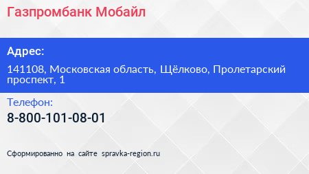 Газпромбанк Мобайл по адресу 141108, Московская область, Щёлково, Пролетарский проспект, 1 в дальнейшем Организация, размещена в следующих категориях: