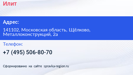 Илит по адресу 141102, Московская область, Щёлково, Металлоконструкций, 2а в дальнейшем Организация, размещена в следующих категориях: