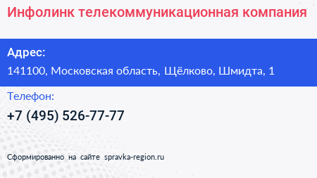 Инфолинк, телекоммуникационная компания по адресу 141100, Московская область, Щёлково, Шмидта, 1 в дальнейшем Организация, размещена в следующих категориях: