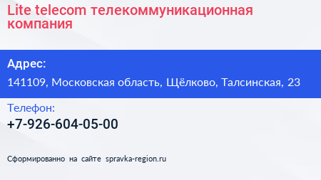 Lite-telecom, телекоммуникационная компания по адресу 141109, Московская область, Щёлково, Талсинская, 23 в дальнейшем Организация, размещена в следующих категориях: