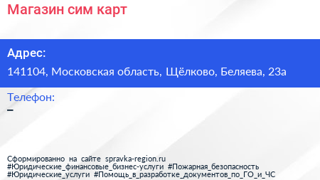 Магазин сим-карт по адресу 141104, Московская область, Щёлково, Беляева, 23а в дальнейшем Организация, размещена в следующих категориях: