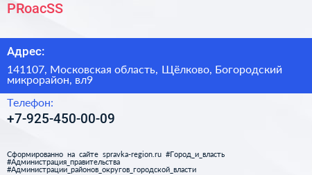 PRoacSS по адресу 141107, Московская область, Щёлково, Богородский микрорайон, вл9 в дальнейшем Организация, размещена в следующих категориях: