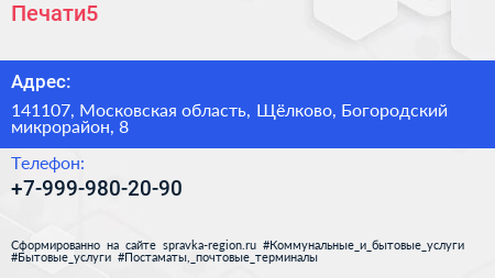 Печати5 по адресу 141107, Московская область, Щёлково, Богородский микрорайон, 8 в дальнейшем Организация, размещена в следующих категориях:
